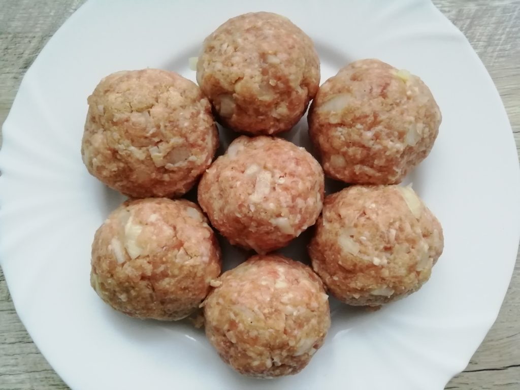 Teraz zacznij układać składniki na tacy w następującej kolejności. Umieść jeden klopsik między dwoma ziemniakami i naciśnij. Tak przygotowane układamy w okrąg.