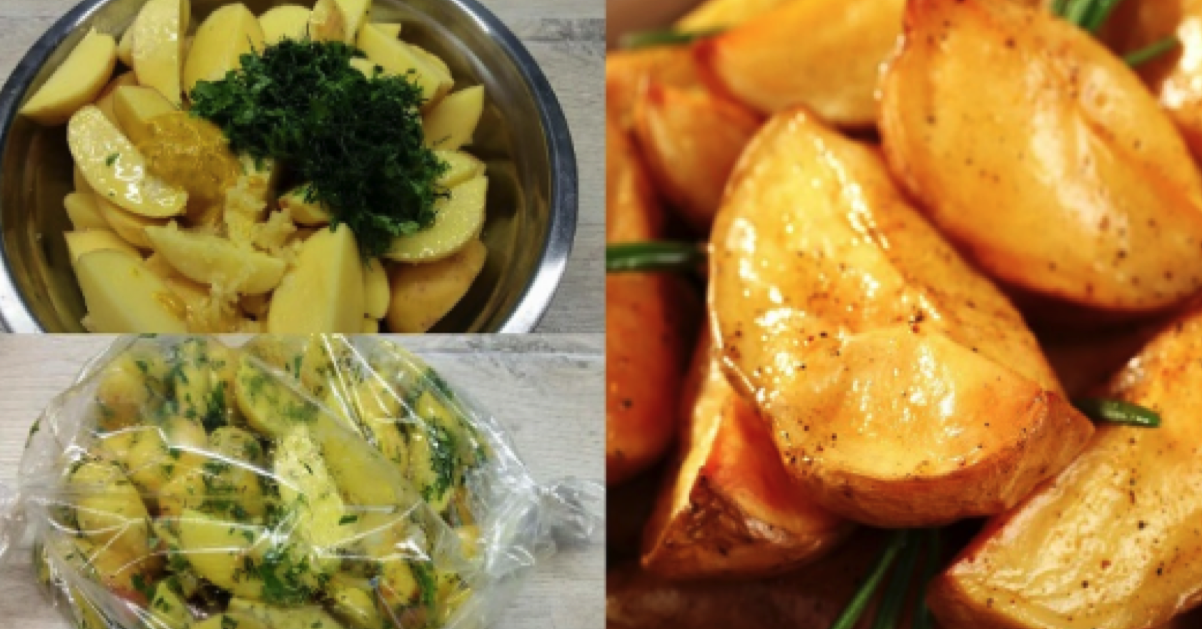 Ziemniaki wrzucamy do rękawa (większe bulwy kroimy na pół), następnie zalewamy je przygotowanym wcześniej sosem. W worku robimy kilka dziurek i układamy go w naczyniu żaroodpornym. Ziemniaki pieczemy 40 – 60 minut w piekarniku nagrzanym do 180 stopni.
